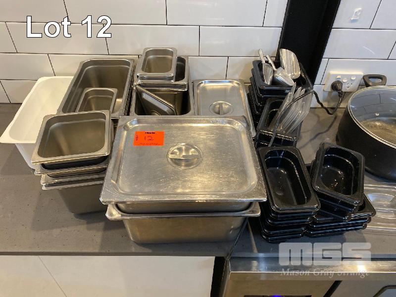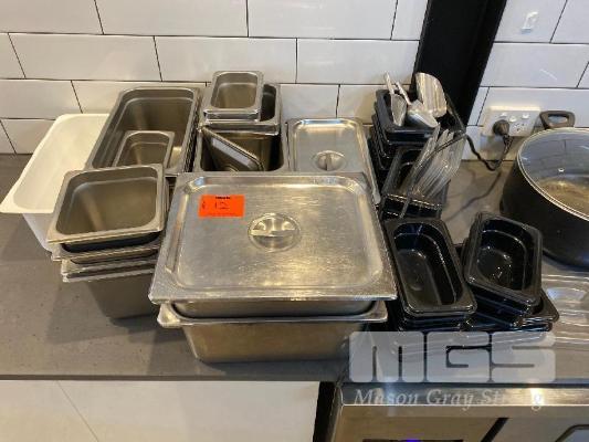 19 x STAINLESS STEEL GASTRONORM TRAYS, ASSORTED SIZES, 20 x PVC GASTRONORM TRAYS, ASSORTED SIZES