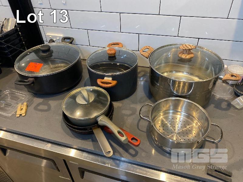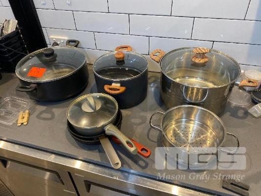 4 x ASSORTED POTS WITH LIDS, 2 x SMALL FRY PANS & COLANDER