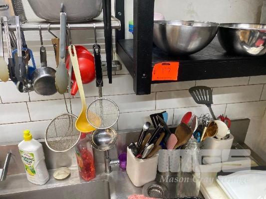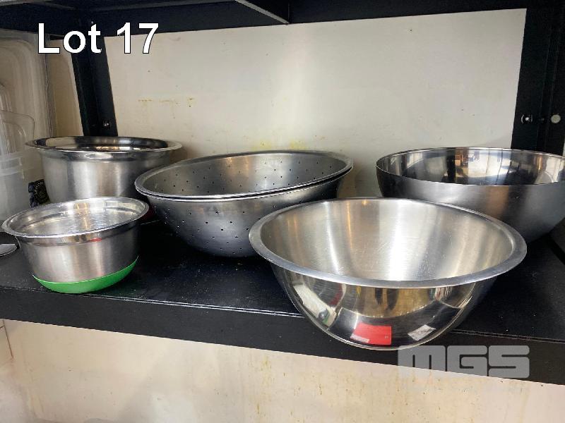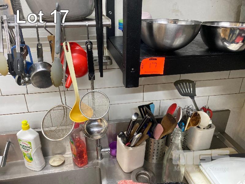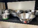 QUANTITY COOKWARE, KNIVES, SPATULAS, WOODEN SPOONS, CHOPPING BOARDS, SCISSORS, STRAINERS ETC. 8 x STAINLESS STEEL BOWLS & COLANDER