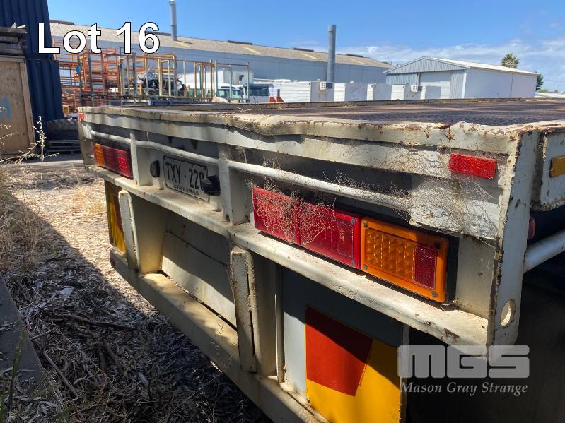 45' (13.7m) TRI AXLE SEMI TRAILER FLAT TOP REG: TXY 220 (SA) PLANT NO: T5 HUBOMETER: STEMCO 1,108kms SHOWING SPRING SUSPENSION, 11R22.5, DRUM BRAKES, CHECKER PLATE STEEL DECK SET GATES 2 x UNDER TRAY TOOL BOXES UNDER TRAY BEARING CAGE TYRES: AVERAGE CONDITION 1 x GATE (WITH PAPERS)