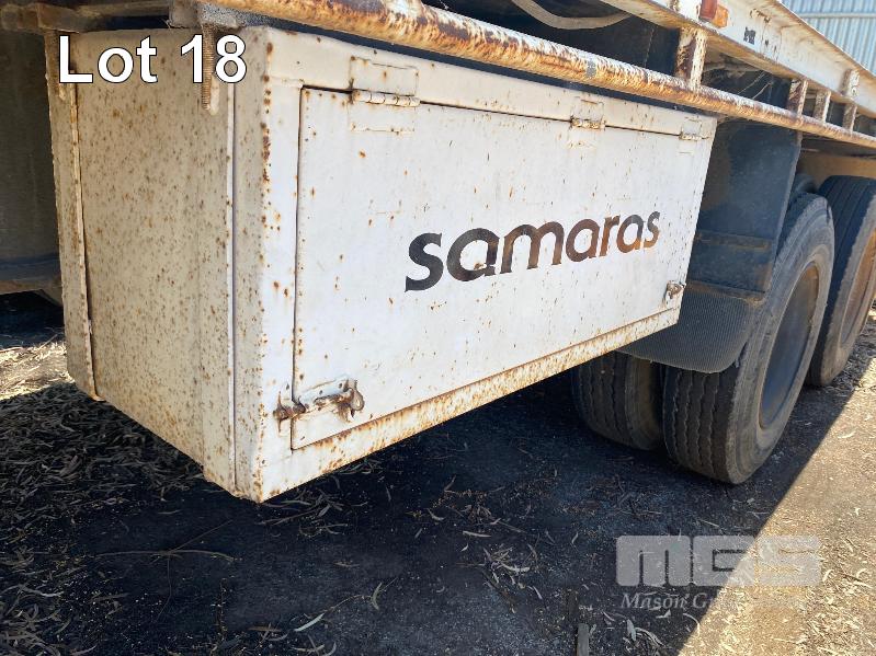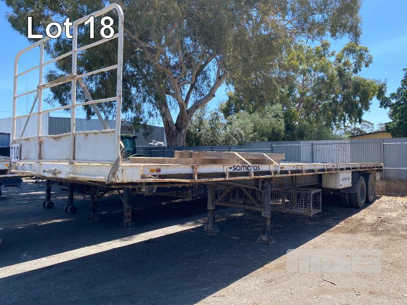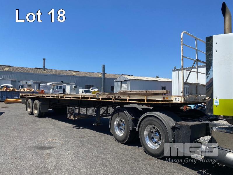 41' (12.5m) TANDEM AXLE SEMI TRAILER FLAT TOP REG: YCJ 276 (SA) PLANT NO: T10 HUBOMETER: DATA TRAC 343kms SHOWING SPRING SUSPENSION, SPIDER RIMS, 295/80R 22.5, DRUM BRAKES, TOOLBOX, CHECKER PLATE STEEL DECK 1 x FRONT GATE UNDER TRAY BEARING CAGE TYRES: AVERAGE CONDITION 8 x CONTAINER LOCKING PINS (WITH PAPERS)