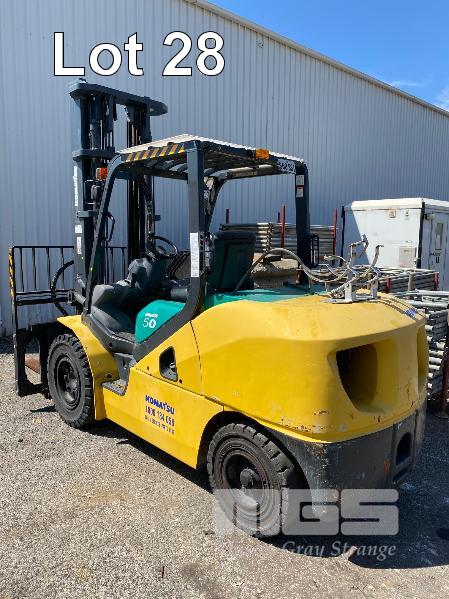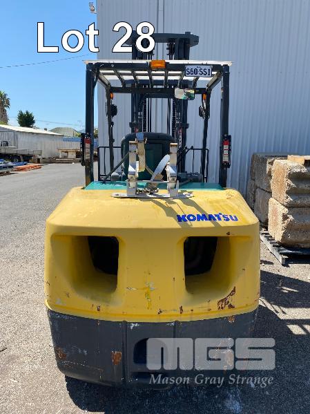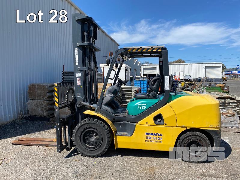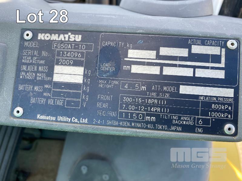 2009 KOMATSU FORKLIFT 4.2T CAP. MOD: FG50AT-10 S/NO: 134096 REGO NO: S60SSI 6 CYLINDER NISSAN PETROL/LPG ENGINE HOURS: 3138 SHOWING MAX LIFT HEIGHT: 4,500mm MAX LIFT WEIGHT 4200kg 2 STAGE MAST WITH SIDESHIFT & TYNE SHIFT SOILD TYRES, RUNS WELL NEW STARTER MOTOR FITTED KEY #52
