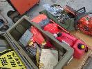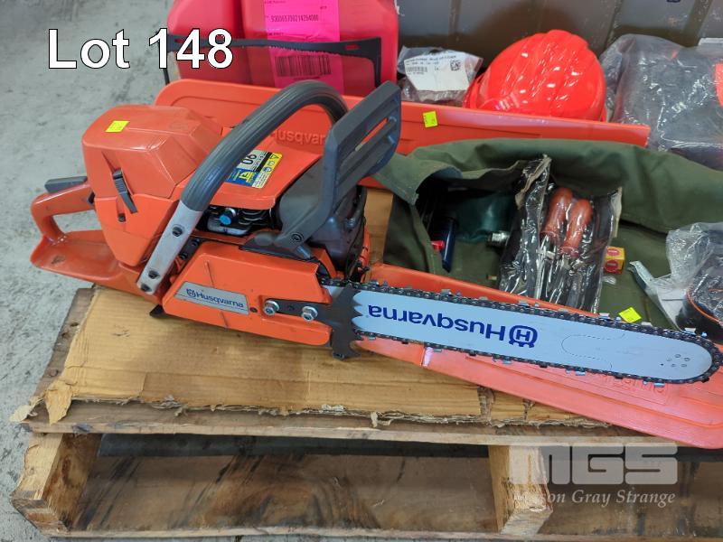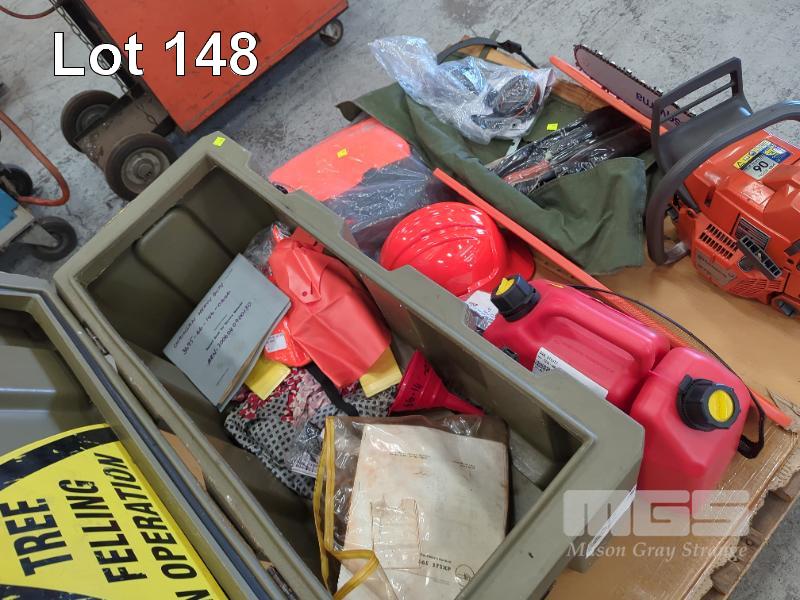 CHAINSAW, HUSQVARNA MOD: 372XP PETROL, 2 STROKE FITTED WITH 400mm BAR WITH HUGE ASSORTMENT OF ACCESSORIES INCLUDING NEW 600mm BAR SHARPENING & TOOL KITS TO SUIT, SAFETY GEAR, WEDGES, POLY FUEL CAN & MIL SPEC STORAGE CASE, GREEN POLY, 900 x 400 x 400mm