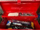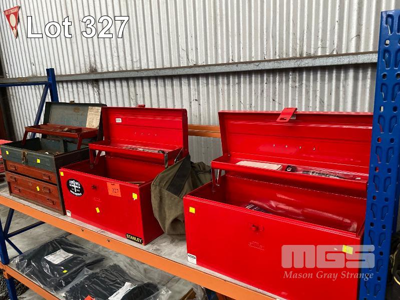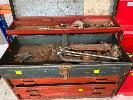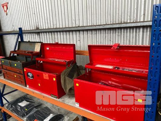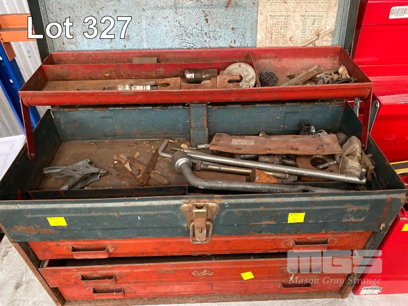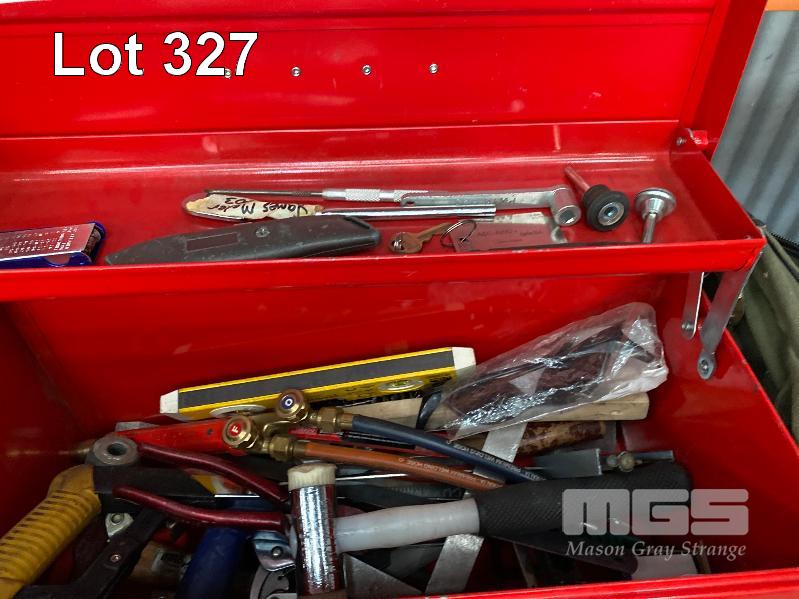 TOOLBOX INCLUDING SCREWDRIVER SET, HAMMER, FILES, TAPE MEASURE, SQUARES, ETC & ENGINEERS TOOLBOX WITH OXY TORCH, G-CLAMPS, HAMMER, HACKSAW, RULERS, TAPE MEASURE, PLUS 3 DRAWER TOOL BOX 1 x SHELF