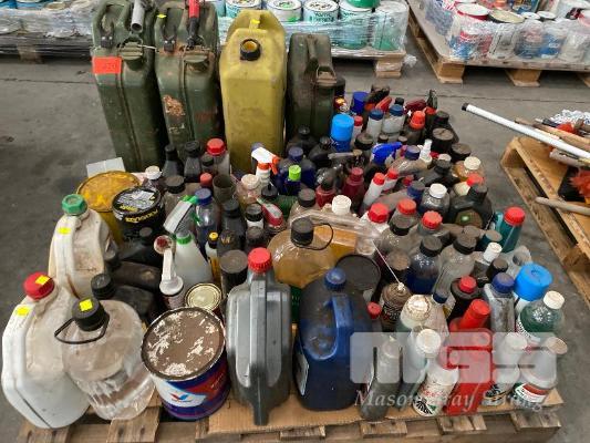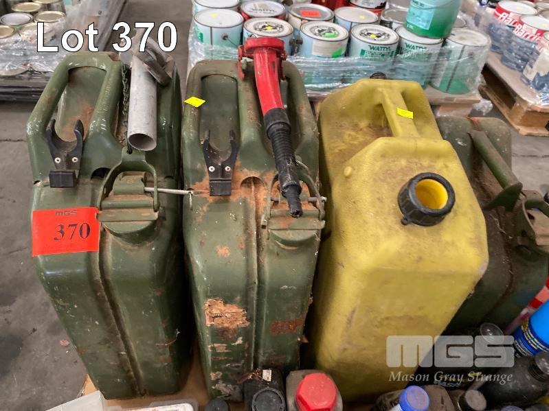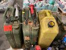 2 x STEEL JERRY CANS, 20 LITRE, POLISH, THINNERS, OILS, BRAKE FLUID,