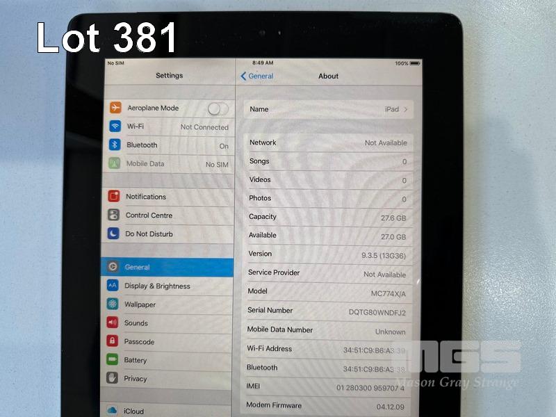 10 x APPLE iPADS (MOST iCLOUD LOCKED) & 2 x APPLE iPHONES APPLE iPAD 2, 16GB, A1395 APPLE iPAD 2, 32GB, A1395 APPLE iPAD 2, 32GB, A1395 (iCLOUD LOCKED) APPLE iPAD 3RD GEN, 64GB, A1416 (iCLOUD LOCKED) APPLE iPAD 2, 64GB, A1396 (iCLOUD LOCKED) APPLE iPAD 2, 16GB, A1395 (iCLOUD LOCKED) APPLE iPAD 3RD GEN, 32GB, A1430 (iCLOUD LOCKED) APPLE iPAD 3RD GEN, 64GB, A1430 (iCLOUD LOCKED) APPLE iPAD 2, 64GB, A1396 APPLE iPAD 2, 32GB, A1396 (iCLOUD LOCKED) 2 x APPLE iPHONE 4, 16GB A1332 (NO CABLES, NO CHARGERS) S/N:DYTM626MDFHW, DQTG80WNDFJ2, DLXGN7Q5DFJ2, DYTHG70SDJ8V, DLXG1QE3DKNY, DYTM61PHDFHW, DYTHXLNKDVGH, DYTJ12JXDVGJ, DLXG9BYDDFJ3, DKVKK0FMDFJ2, 7R0405TDA4S, 86037WRAA4S