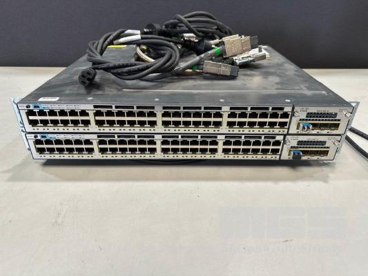 2 x CISCO CATALYST 3750-X SERIES 48-PORT SWITCHES, WS-C3750X-48P-S V03 EACH WITH C3KX-NM-1G NETWORK MODULE, STACK CABLES & IEC-C15 NOTCH POWER CABLES S/N:FDO1631P07J, FDO1630R3XU