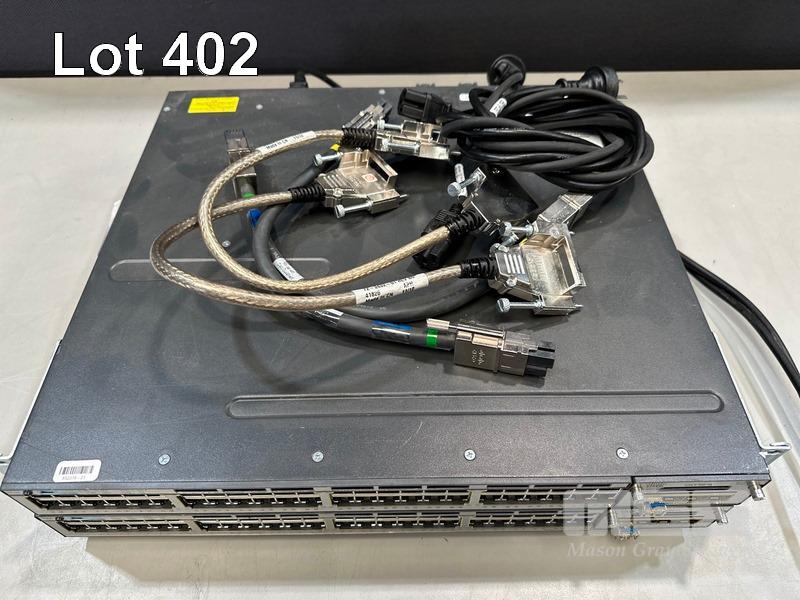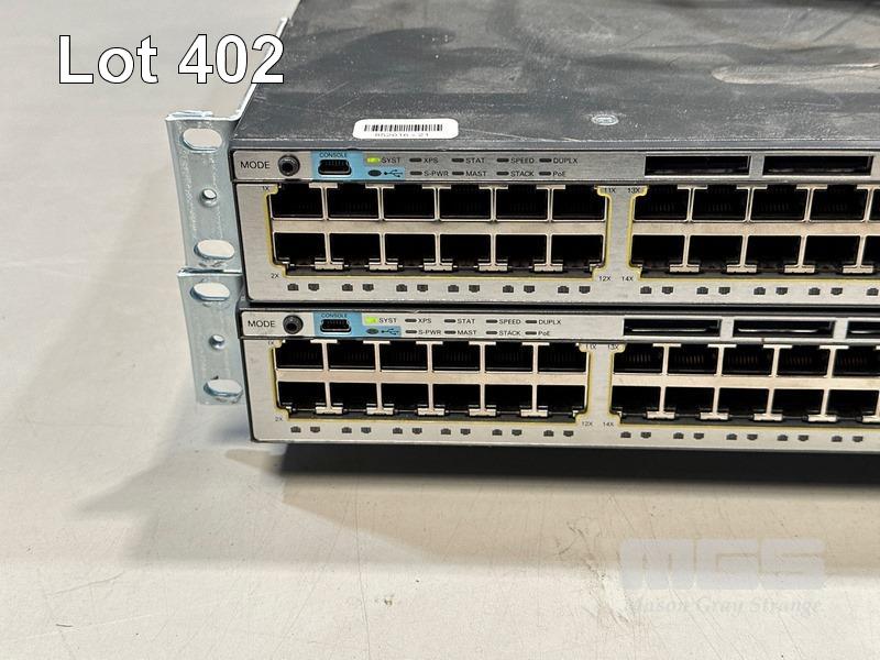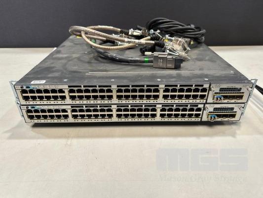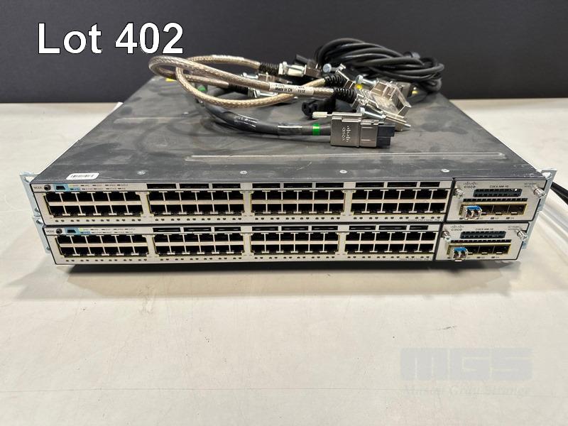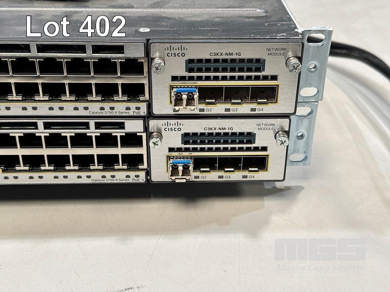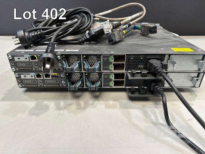 2 x CISCO CATALYST 3750-X SERIES 48-PORT SWITCHES, WS-C3750X-48P-S V03 EACH WITH C3KX-NM-1G NETWORK MODULE, STACK CABLES & IEC-C15 NOTCH POWER CABLES S/N:FDO1631Z08E, FDO1635P0S5