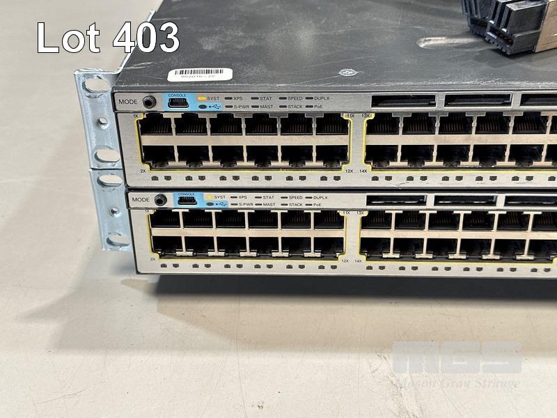 2 x CISCO CATALYST 3750-X SERIES 48-PORT SWITCHES, WS-C3750X-48P-S V03 EACH WITH C3KX-NM-1G NETWORK MODULE, STACK CABLES & IEC-C15 NOTCH POWER CABLES S/N:FDO1630P1W4, FDO1636X1RL