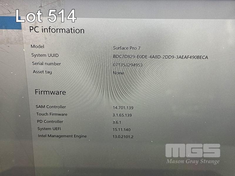 TABLET PC, MICROSOFT SURFACE PRO 7, MODEL 1866, CORE i5 1035G4 (10TH GEN) @ 1.1GHz, 8GB RAM, 128GB SSD, 12.3" TOUCHSCREEN (2736x1824), INTEL IRIS PLUS GRAPHICS, Wi-Fi, BLUETOOTH, WINDOWS 11 HOME INSTALLED, KEYBOARD TYPE COVER & GENERIC POWER SUPPLY (NOTE: DAMAGED) S/N:071353294953