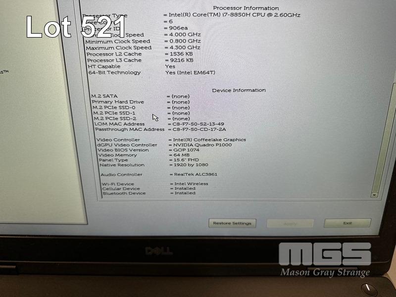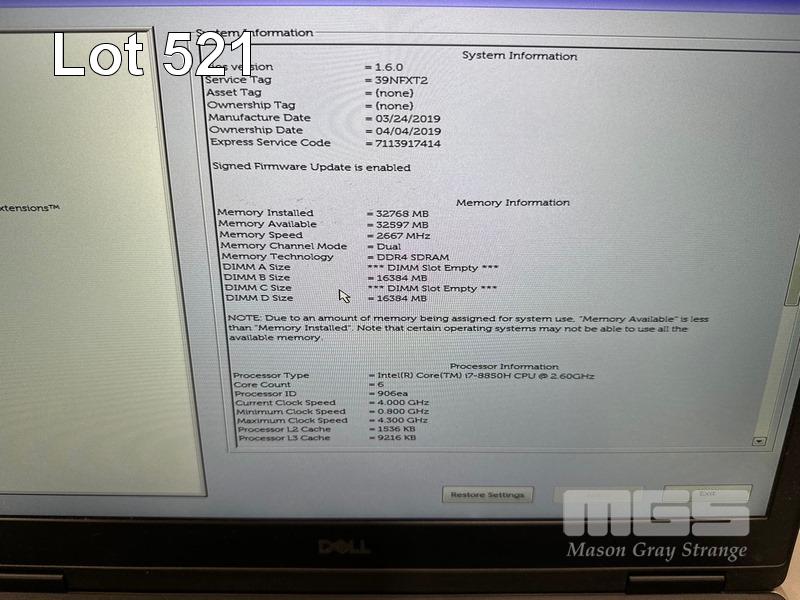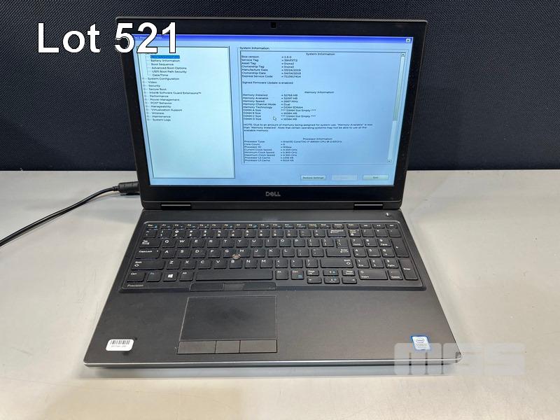 LAPTOP, DELL PRECISION 7530 WORKSTATION, CORE i7 8850H (8TH GEN) @ 2.6GHz, 32GB DDR4 RAM, NO HDD, 15.6" WIDESCREEN (1920x1080), NVIDIA QUADRO P1000 VIDEO, Wi-Fi, CELLULAR, BLUETOOTH (NO POWER SUPPLY) (NOTE: NO BATTERY, DUSTY CONDITION) S/N:39NFXT2