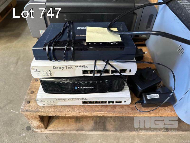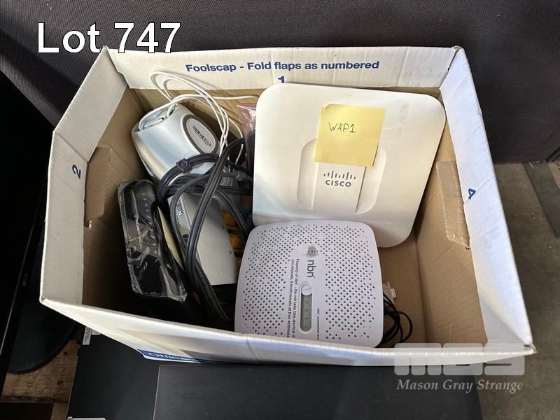 1 x PALLET LOT INC. BROTHER PRINTER, CANON PRINTER, INK CARTRIDGES, CABLES, MODEMS, 4 x MONITORS, CISCO ACCESS POINT, EATON & DIGITECH UPS, INCOMPLETE MONITOR ARMS, ZTE SWITCH, RACKMOUNT TRAYS, PLANTRONICS HEADSETS