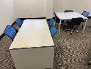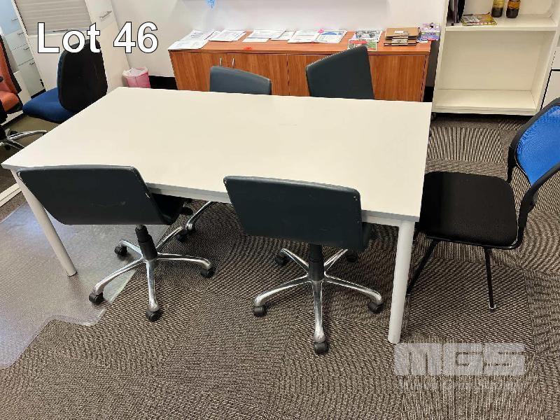 1 x BOARDROOM TABLE, STEEL FRAME GREY TIMBER LAMINATE TOP 2400 x 1200mm 1 x GREY TIMBER LAMINATE DESK 1800 x 900mm 3 x GREY TIMBER LAMINATE CLASSROOM TABLES, STEEL FRAME 2 @ 1800 x 900mm 1 @ 1200 x 1200mm (LOCATED ON 7TH FLOOR) 17 x GASLIFT OFFICE CHAIRS, BLACK VINYL, CHROME BASE 6 x CLOTH CLASSROOM CHAIRS, PLASTIC BASES