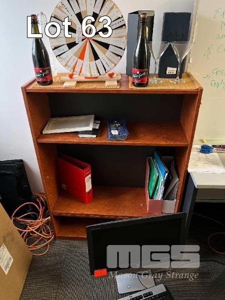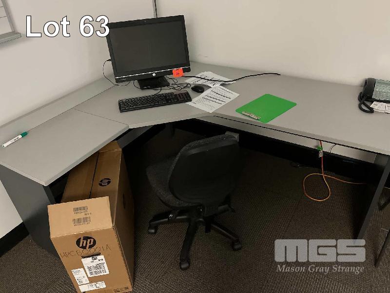 2 x TIMBER LAMINATE L SHAPE DESKS, 1800 x 1700mm, GREY, WITH 3 DRAWER UNDER DESK MOBILE, 3 TIER TIMBER LAMINATE BOOK SHELF, 4 DRAWER STORAGE CABINET, TIMBER LAMINATE, 2x GAS LIFT OFFICE CHAIRS (LOCATED ON 7TH FLOOR)