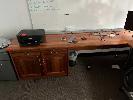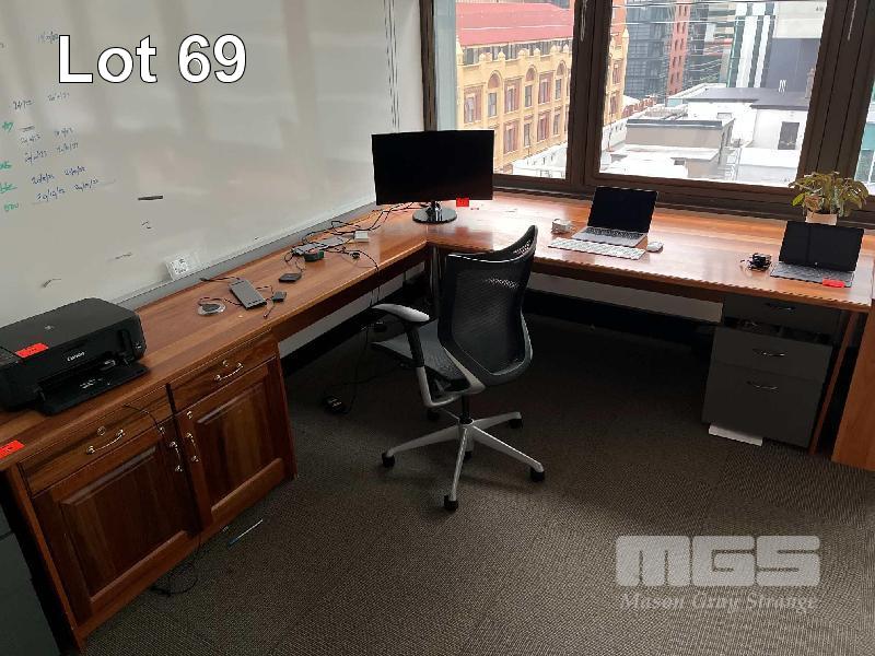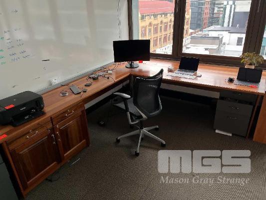 SOLID TIMBER EXECUTIVE DESK, L SHAPE, 2800 x 3000mm, 2 x DRAWERS, 2 x CUPBOARD DOORS, WITH PAIR OF 3 DRAWER UNDER DESK MOBILES, HIGH BACK GAS LIFT OFFICE CHAIR (LOCATED ON 7th FLOOR)