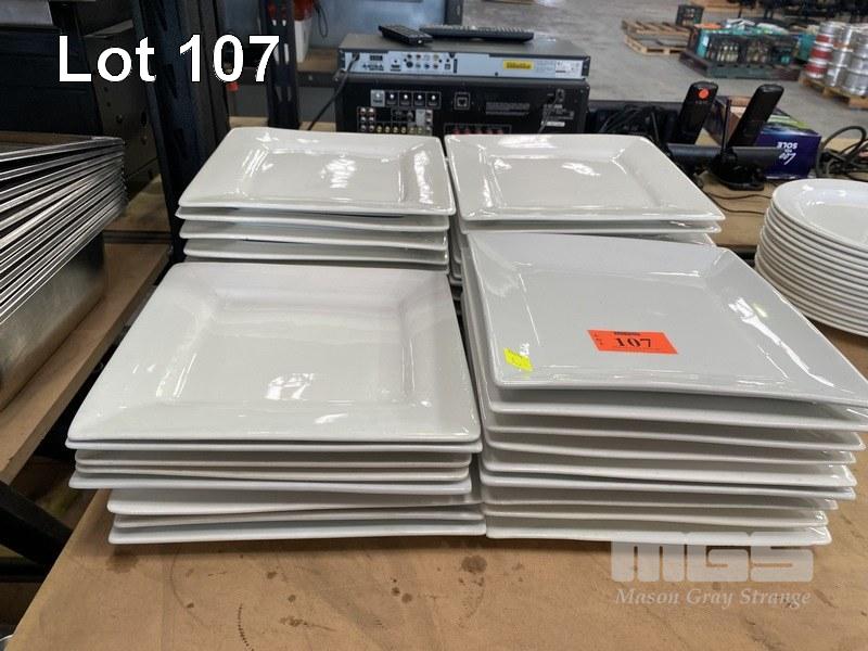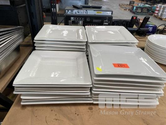 38 x WHITE SQUARE PLATES, 25 x 25cm (SOME CHIPS)