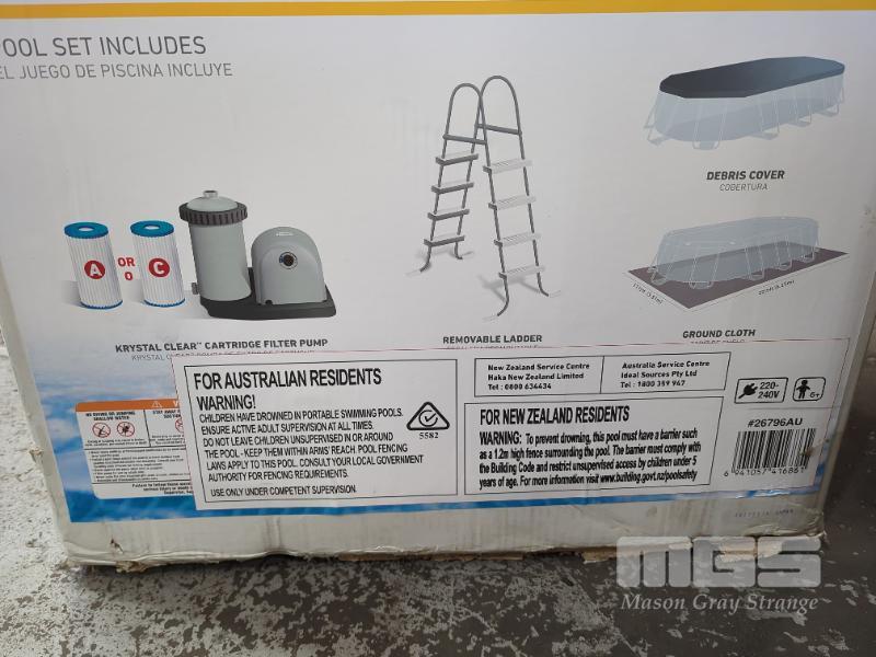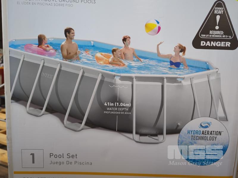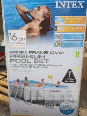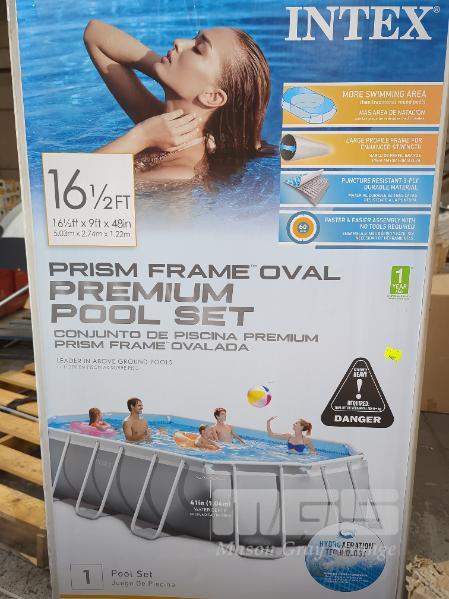 INTEK PREMIUM ABOVE GROUND POOL SET COMPRISING 5M PRISM FRAME OVAL SWIMMING POOL, KRYSTAL CLEAR CARTRIDGE FILTER PUMP & HOSES, LADDER, POOL COVER AND GROUND SHEET. POOL DIMENSIONS: 5.03 X 2.74 X 1.22 M (W D H) POOL VOLUME: 13,365 L. ALL NEW IN BOX
