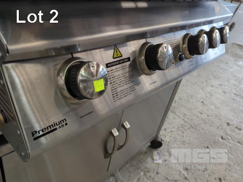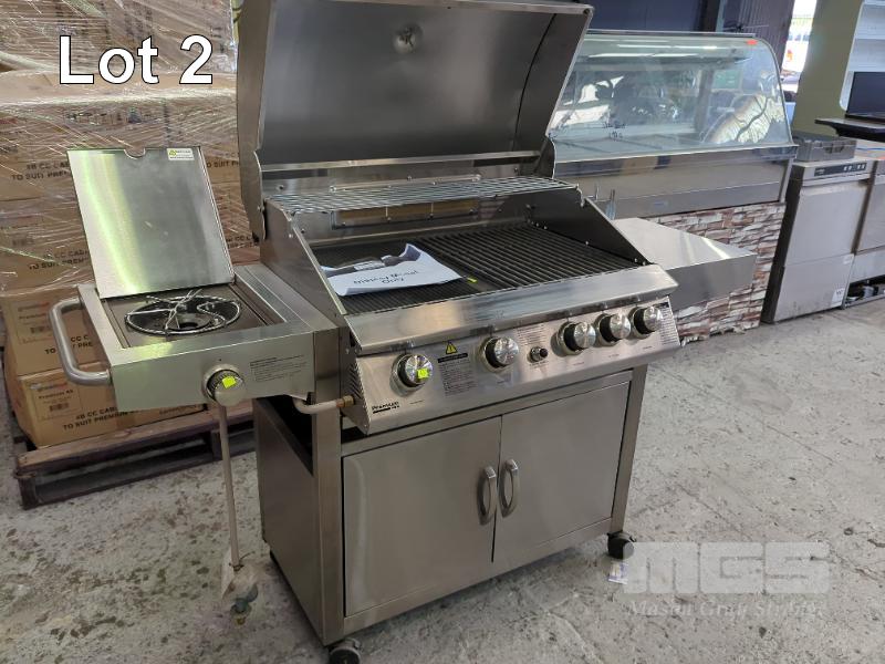 GRANDHALL PREMIUM 4S MOBILE STAINLESS STEEL COVERED GAS BBQ ON CABINET TROLLEY. FEATURES STAINLESS STEEL HOOD, 2-DOOR STAINLESS STEEL CABINET TROLLEY WITH 4-BURNERS PLUS BACK-BURNER, SIDEBURNER AND ELECTRONIC IGNITION. MODEL 1001SPP NEW IN BOX (2 X BOXES). ORP $1,599 NO GST