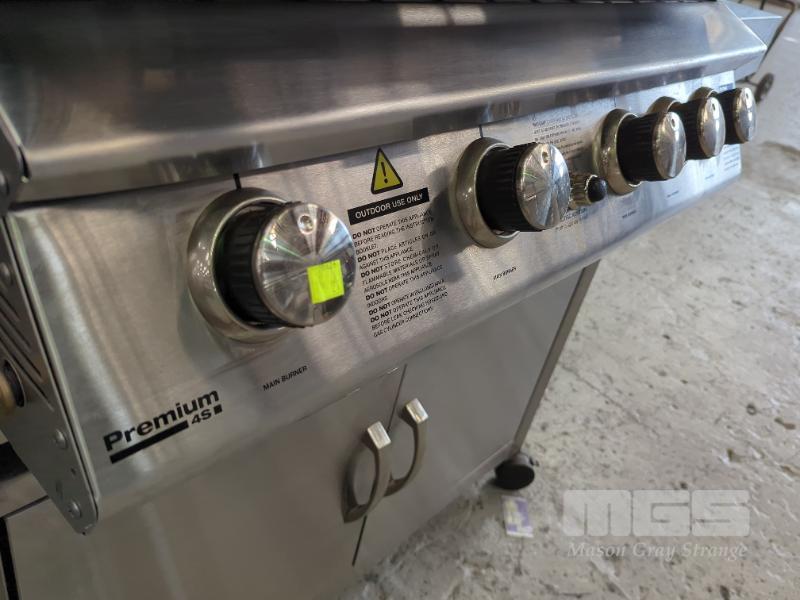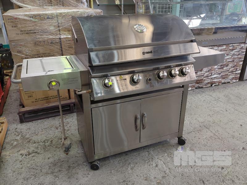 GRANDHALL PREMIUM 4S MOBILE STAINLESS STEEL COVERED GAS BBQ ON CABINET TROLLEY. FEATURES STAINLESS STEEL HOOD, 2-DOOR STAINLESS STEEL CABINET TROLLEY WITH 4-BURNERS PLUS BACK-BURNER, SIDEBURNER AND ELECTRONIC IGNITION. MODEL 1001SPP NEW IN BOX (2 X BOXES). ORP $1,599