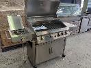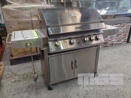 GRANDHALL PREMIUM 4S MOBILE STAINLESS STEEL COVERED GAS BBQ ON CABINET TROLLEY.