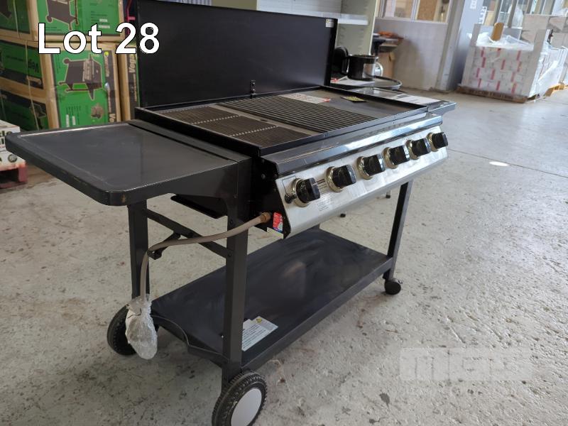 GRILLMASTER MOBILE FLAT TOP GAS BBQ 6-BURNER WITH TROLLEY. MODEL 1000-6B. NEW IN BOX. ORP $699