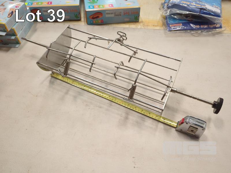 17.5 X 8" STAINLESS STEEL ROTISSERIE CRADLE, HANDLE, CLAW CLAMPS & CLAWS.