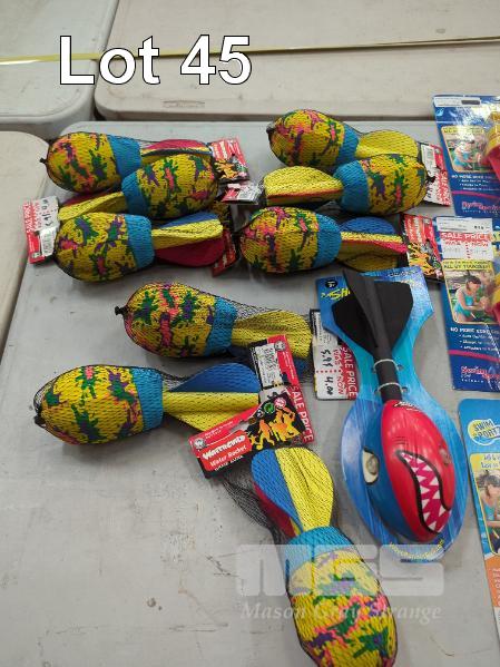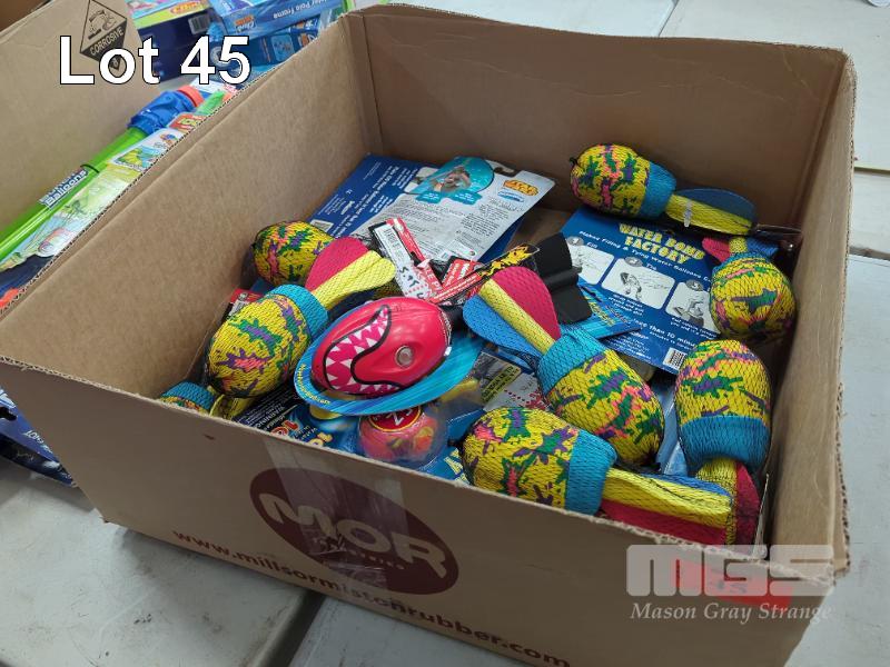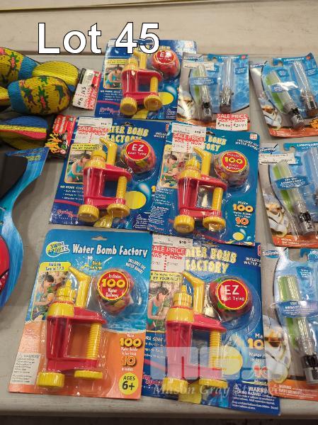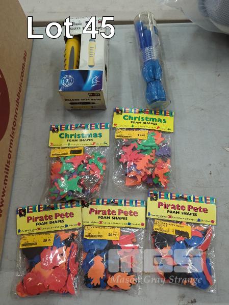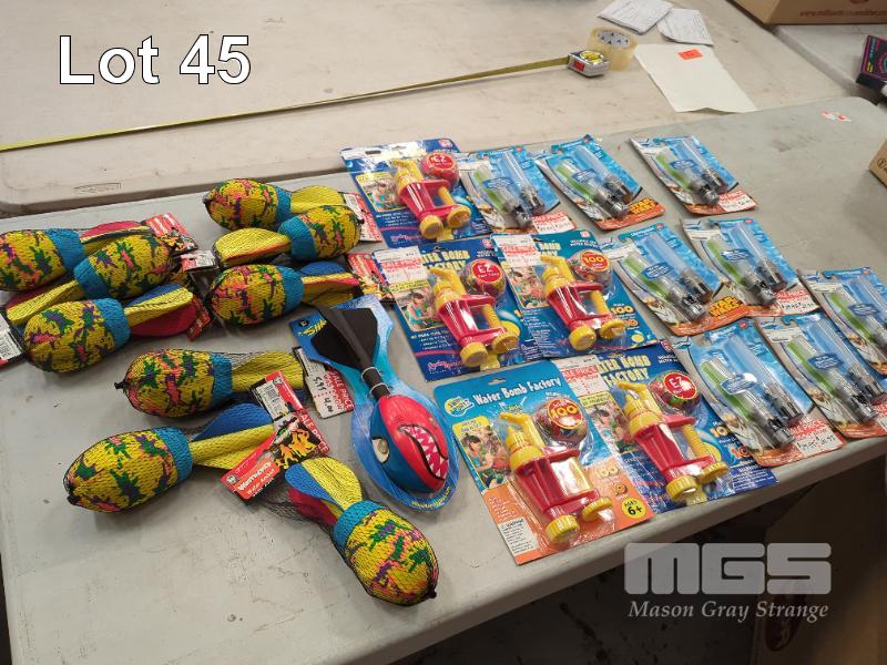 COLLECTION OF ASSORTED STOCKING FILLER TOYS. INCLUDES WATER ROCKETS, WHISTLING FOOTBLL, POOL LIGHT SABERS & WATER BOMB FACTORY PACKS, FOAM SHAPES, SKIPPING ROPES ETC ALL NEW IN ORIGINAL PACKAGING