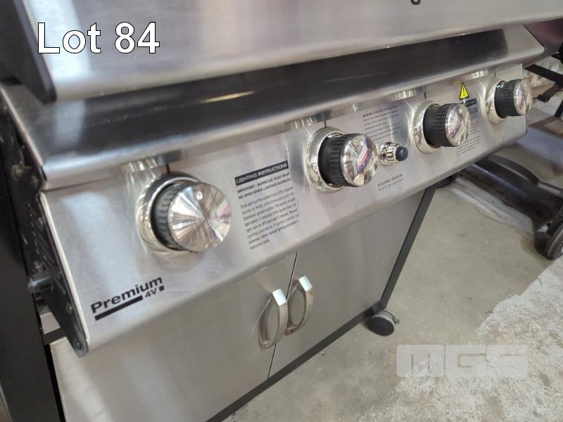 GRANDHALL PREMIUM 4V MOBILE GLOSS BLACK COVERED GAS BBQ ON CABINET TROLLEY. FEATURES MATCHING HOOD & 2-DOOR MATCHING CABINET, 4-BURNERS PLUS SIDEBURNER AND ELECTRONIC IGNITION. MODEL 1001SPP NEW IN BOX (2 x BOXES). ORP $799