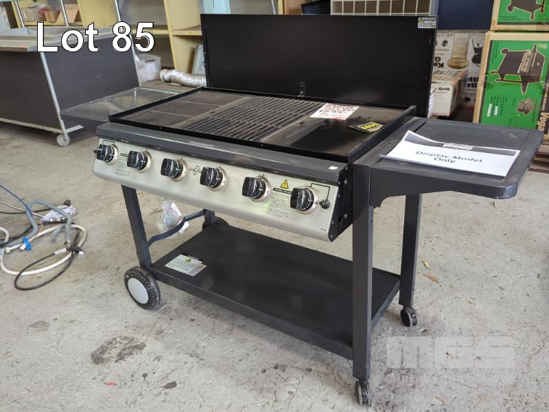 GRILLMASTER MOBILE FLAT TOP GAS BBQ 6-BURNER WITH TROLLEY.