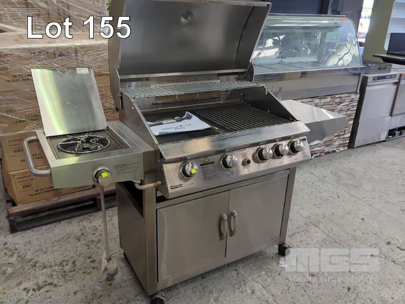 FEATURES STAINLESS STEEL HOOD, 2-DOOR STAINLESS STEEL CABINET TROLLEY WITH 4-BURNERS PLUS BACK-BURNER, SIDEBURNER AND ELECTRONIC IGNITION.