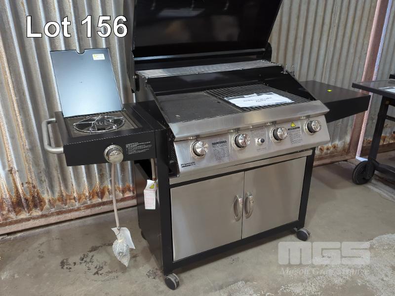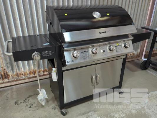 GRANDHALL PREMIUM 4V MOBILE GLOSS BLACK COVERED GAS BBQ ON CABINET TROLLEY. FEATURES MATCHING HOOD & 2-DOOR MATCHING CABINET, 4-BURNERS PLUS SIDEBURNER AND ELECTRONIC IGNITION. MODEL 1001SPP NEW IN BOX (2 x BOXES). ORP $799