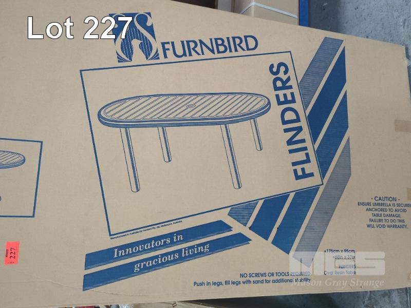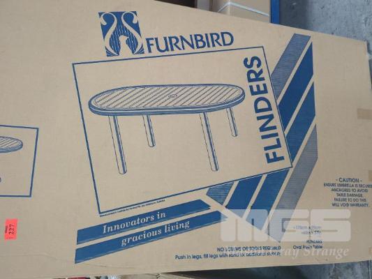 FURNBIRD "FLINDERS" OVAL RESIN OUTDOOR TABLE, 175 X 95 CM. COLOUR GREEN WITH UMBRELLA HOLE. NEW IN BOX.