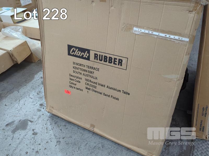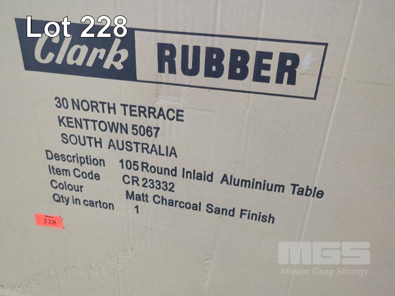 CLARK RUBBER ROUND INLAID ALUMINIUM OUTDOOR TABLE. GLASS WITH MATT CHARCOAL SAND COLOURED FRAME. 105 MM DIA. WITH UMBRELLA HOLE. NEW IN BOX.