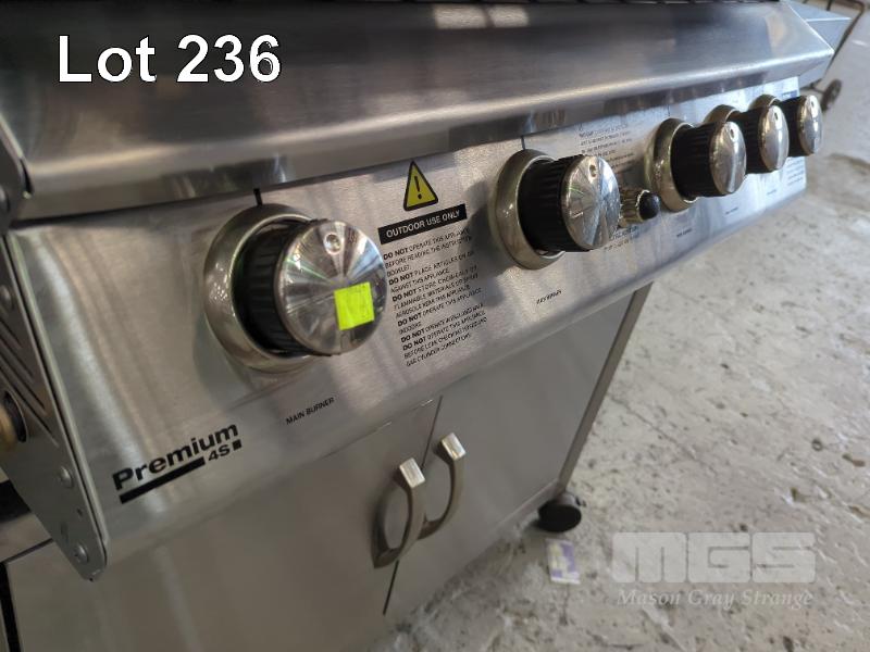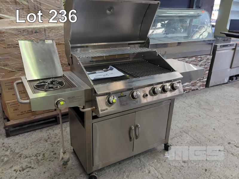 GRANDHALL PREMIUM 4S MOBILE STAINLESS STEEL COVERED GAS BBQ ON CABINET TROLLEY. FEATURES STAINLESS STEEL HOOD, 2-DOOR STAINLESS STEEL CABINET TROLLEY WITH 4-BURNERS PLUS BACK-BURNER, SIDEBURNER AND ELECTRONIC IGNITION. MODEL 1001SPP NEW IN BOX (2 X BOXES). ORP $1,599