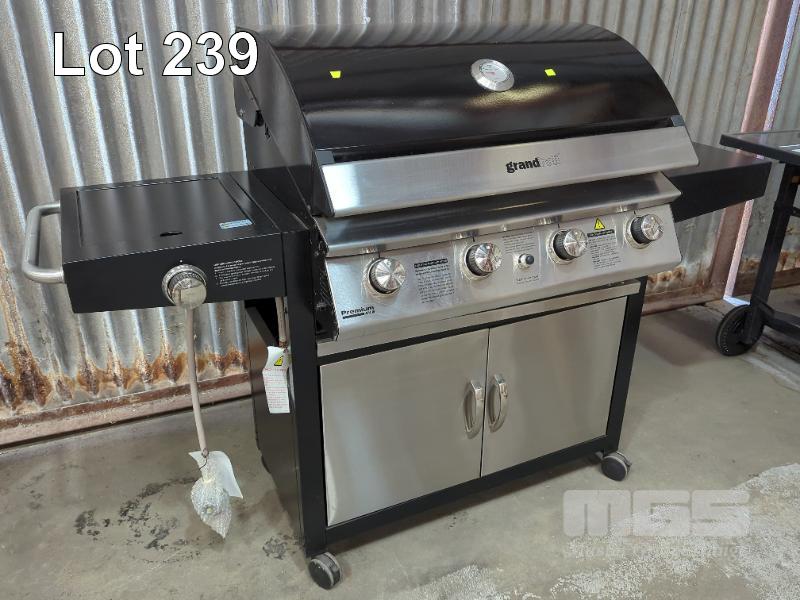 GRANDHALL PREMIUM 4V MOBILE GLOSS BLACK COVERED GAS BBQ ON CABINET TROLLEY. FEATURES MATCHING HOOD & 2-DOOR MATCHING CABINET, 4-BURNERS PLUS SIDEBURNER AND ELECTRONIC IGNITION. MODEL 1001SPP NEW IN BOX (2 x BOXES). ORP $799