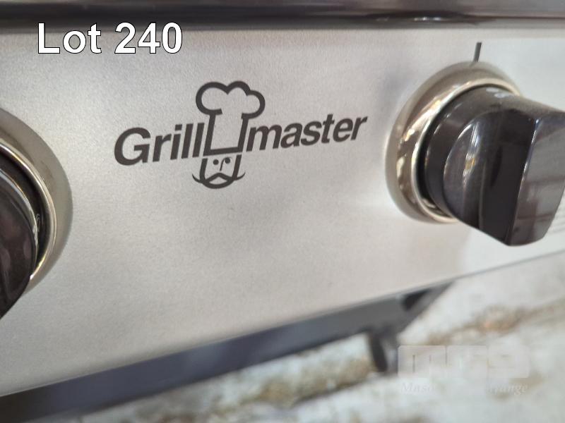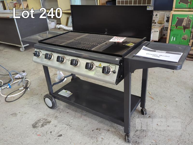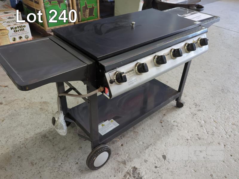 GRILLMASTER MOBILE FLAT TOP GAS BBQ 6-BURNER WITH TROLLEY.
