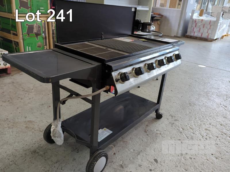 GRILLMASTER MOBILE FLAT TOP GAS BBQ 6-BURNER WITH TROLLEY.