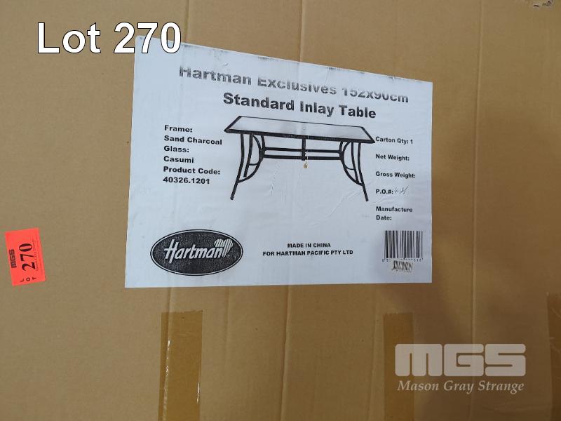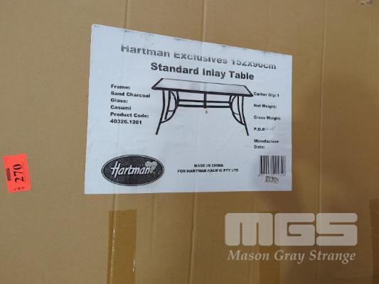 HARTMAN STANDARD RECTANGULAR INLAY OUTDOOR TABLE, 152 X 90 CM. GLASS WITH SAND CHARCOAL COLOURED FRAME. WITH UMBRELLA HOLE. NEW IN BOX.
