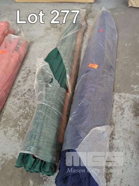 2 X 2.5 M TIMBER LOOK MARKET UMBRELLAS. 1 @ COLOUR GREEN. 1 @ COLOUR NAVY. BOTH NEW
