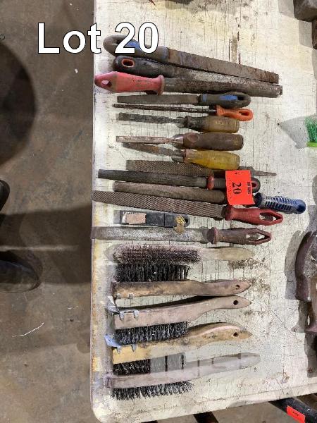 ASSORTED HAND TOOLS, FILES, CHISELS, WIRE BRUSHES