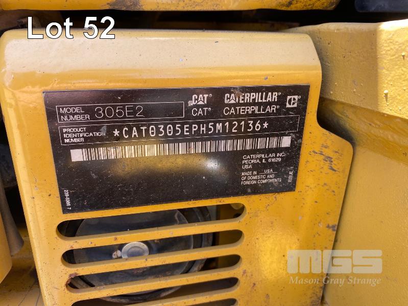 CAT 305E2 EXCAVATOR, PIN: CAT0305EPH5M12136, DOM: 2020, HOURS: 366, REGO: S65SIM, A/C ROPS CABIN, FM RADIO, 1.2m BUCKET WITH GRAB ATTACHMENT, 400mm BUCKET, 335mm BUCKET, 300mm BUCKET, ROCKBREAKER ATTACHMENT, AUGER ATTACHMENT WITH 4 x ASSORTED SIZE AUGER BITS, SKELETON BUCKER, RIPPER ATTACHMENT & COMPACTION WHEEL ATTACHMENT