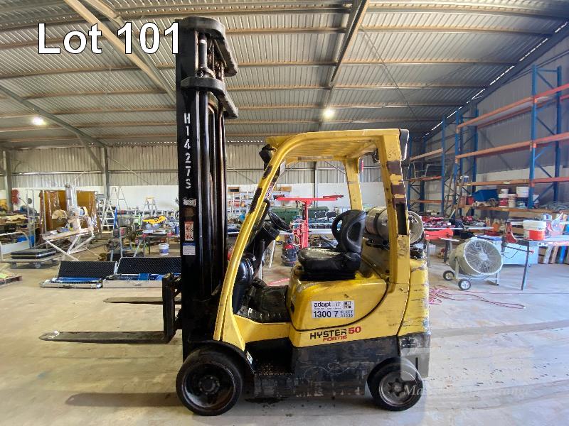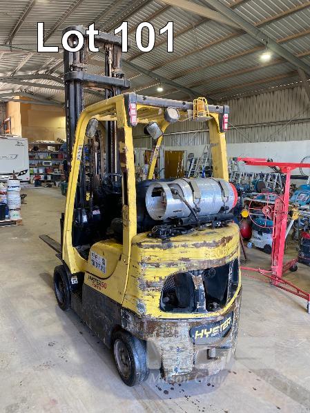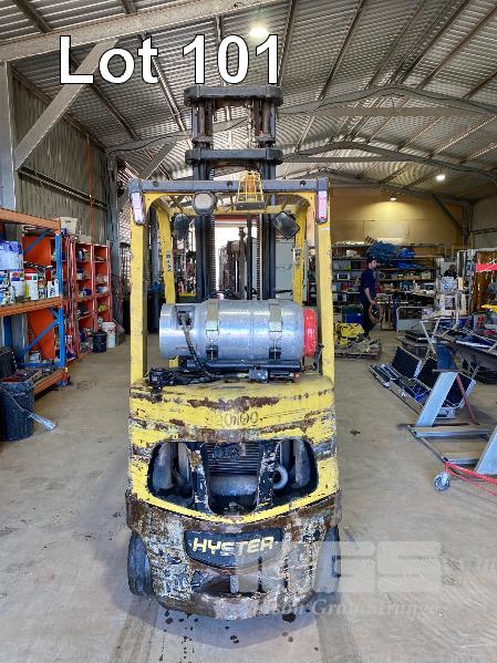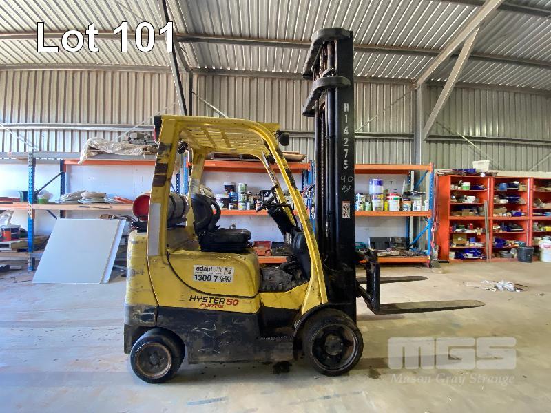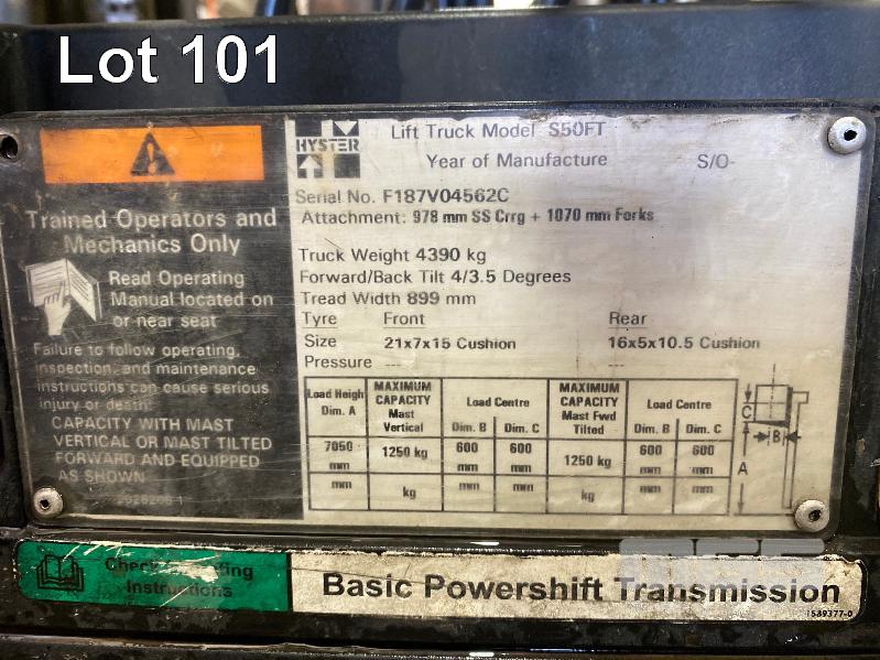 HYSTER FORKLIFT, CAP: 1250kg DOM: 2006 (ESTIMATED) MOD: S50FT, SERIAL: F187V04562C, HOURS: 18,254 3m 3 STAGE MAST, 7m LIFT SIDESHIFT & TILT LIFTING JIB INCLUDED (NOT RATED) LPG BOTTLE NOT INCLUDED SOLID TYRES, WORKLIGHTS, LPG