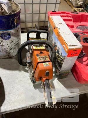 CHAINSAW, STIHL MOD: 026 WITH SAFETY CHAPS, SPARE BAR, CUTTING LUBE & ASSORTED ATTACHMENTS