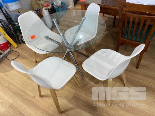 CIRCULAR GLASS COFFEE TABLE, 900mm DIAMETER WITH 4 x WHITE CHAIRS