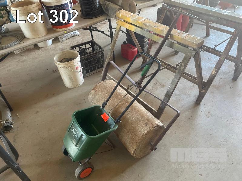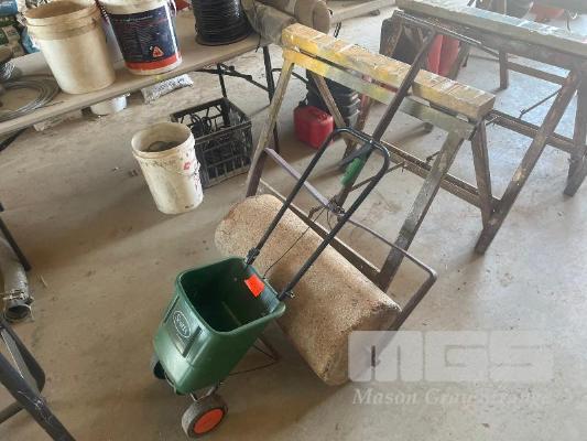 OLD CONCRETE ROLLER, APPROX 100kgs & SCOTTS FERTILISER SPREADER