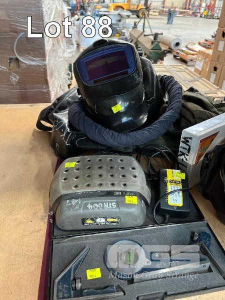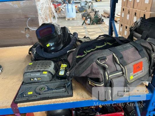 1 x POSITIVE AIR FEED WELDING HELMET, 3M ADFLO AUTO TINT, SPEED GLASS WITH FAN PACK, BATTERY & CHARGER & CARRY BAG, FAT MAX TOOL BAG & ASSORTED HAND TOOLS INC VICE CLAMPS, HAMMERS, PROTRACTOR SET, ETC