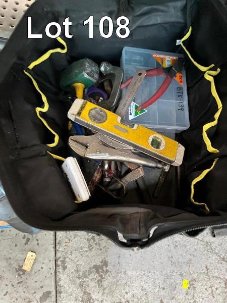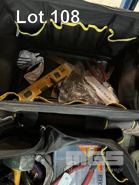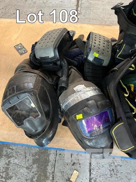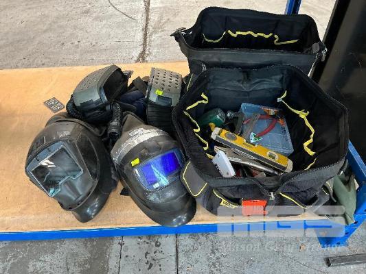 2 x POSITIVE AIR FEED WELDING HELMETS, 3M ADFLO AUTO TINT, SPEED GLASS WITH FAN PACKS, (NO BATTERIES OR CHARGERS) 2 x FAT MAX TOOL BAGS WITH ASSORTED HAND TOOLS, INC VICE GRIPS, M&W COMBINATION SETS, HAMMERS, ETC