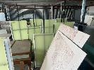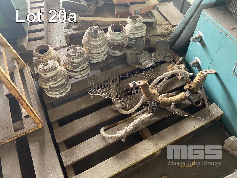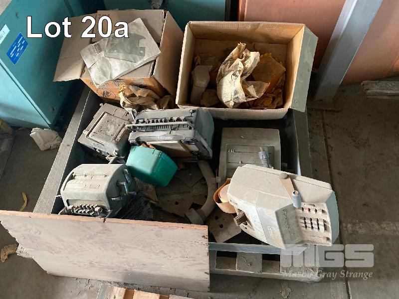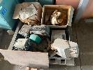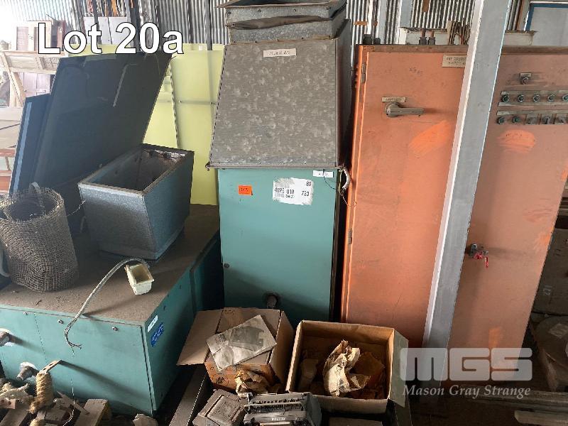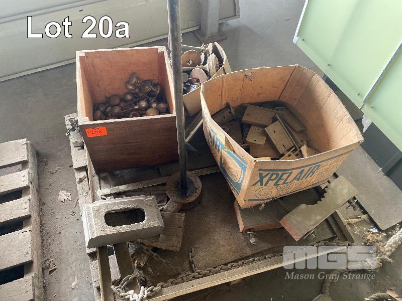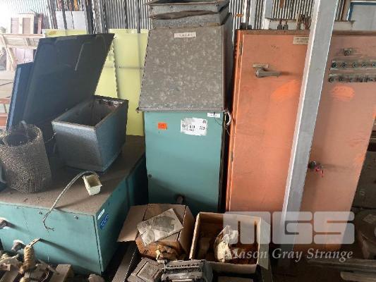 ASSORTED COLLECTABLES, POST BASES, EARLY CALCULATORS, DOOR LOCKS, FIREPLACE SURROUND IN PIECES, WOOD TOOL BOX, ELECTRICAL CABINET & 2 x STEPS, 12 x PALLETS