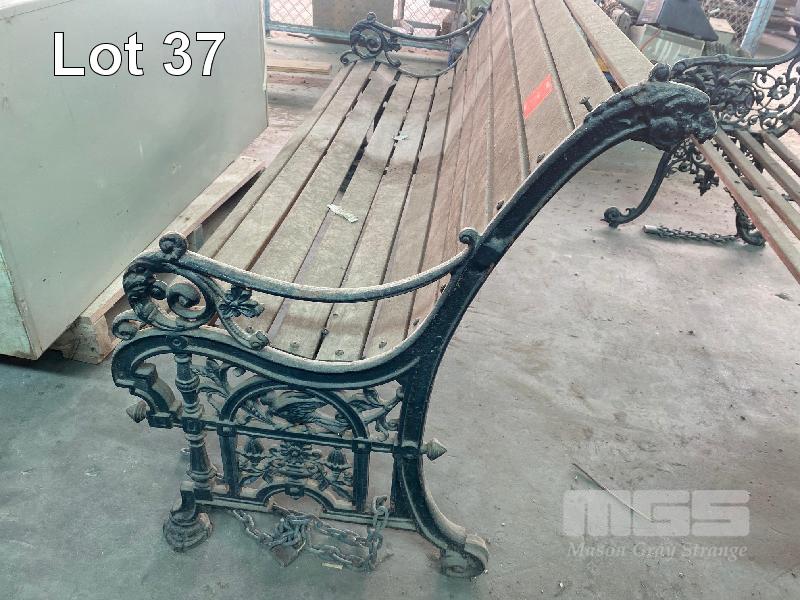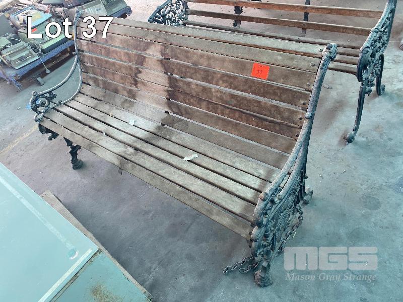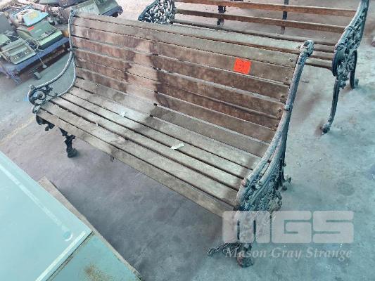 VINTAGE TIMBER BENCH, CAST IRON ENDS