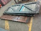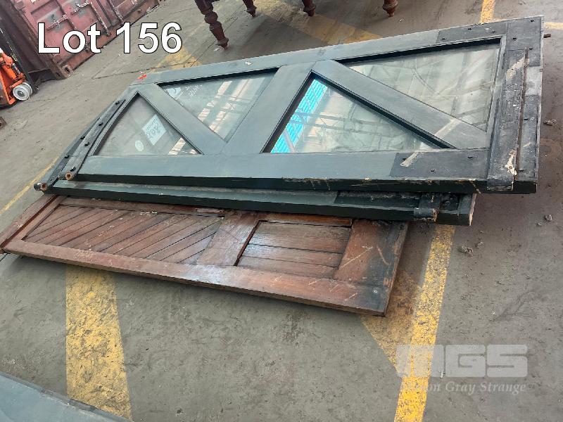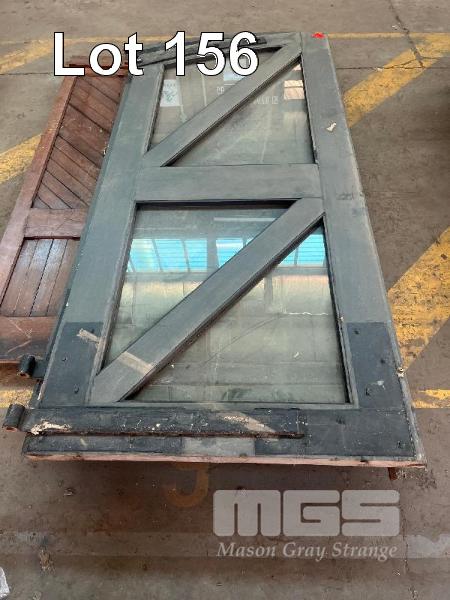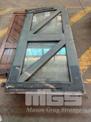 PAIR HEAVY DUTY TIMBER ENTRANCE DOORS, GLAZED, 3000 x 1300mm WITH LARGE HEAVY DUTY STEEL PLATE HINGES